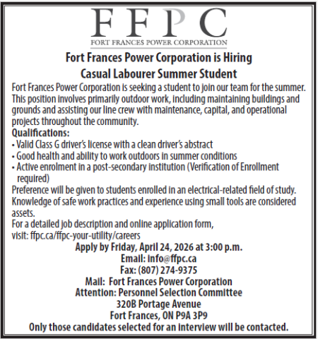 Fort Frances Power Corporation is Hiring a Casual Labourer Summer Student