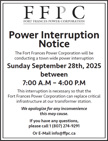 Couchiching, Alberton, Emo and any other surrounding communities will not be affected by the outage.The outage will only affect the customers within the Town of Fort Frances serviced by FFPC.